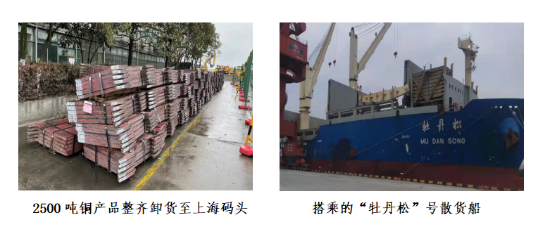 在中色国贸所属中色上海、新桥公司、南非公司和赞比亚公司的共同努力下,2021年12月20日,装载着2500吨铜产品的中远“牡丹松”号散货船在南非德班港正式启航,2022年1月21日下午,顺利靠泊上海龙吴码头。