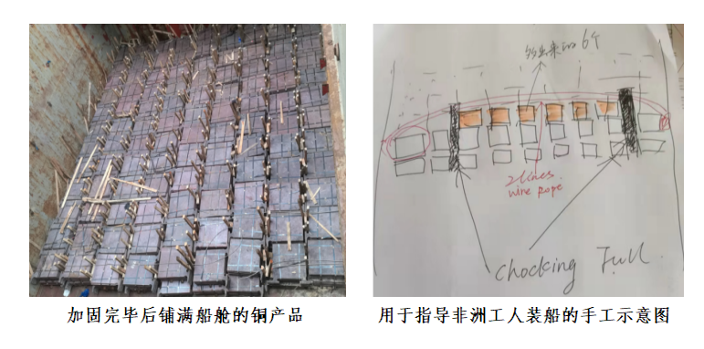 针对疫情导致中国船长及工作人员无法下舱指导非洲工人工作的困难,自主物流员工采用人工手动画图、语音电话等方式对非洲工人进行指导,并协调船员在启航后二次下舱进行检查并完善加固,降低了货物损坏的风险;针对散货船上不同编号的铜产品必须混合装船导致提货分拣困难的问题,采用“涂色”的方式在每一片阳极板“耳朵”处涂抹红色、黑色和白色油漆,用于方便区分不同批次和编号的铜产品,同时根据不同颜色制作详细清单。