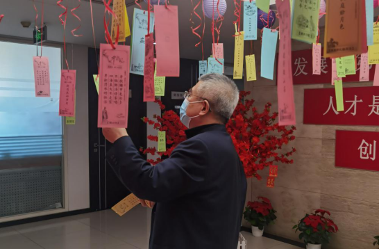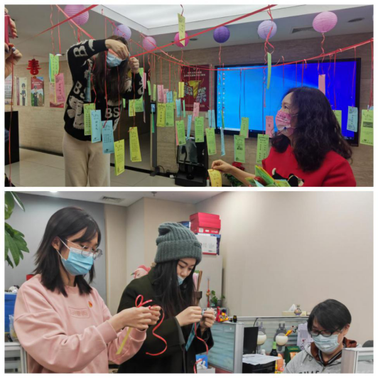 活动现场热闹喜庆。一张张写满灯谜的彩条吸引着前来竞猜的员工,大家热情高涨,积极开动脑筋,三五成群一起讨论,破解谜底。短短时间,150条灯谜被一抢而空。