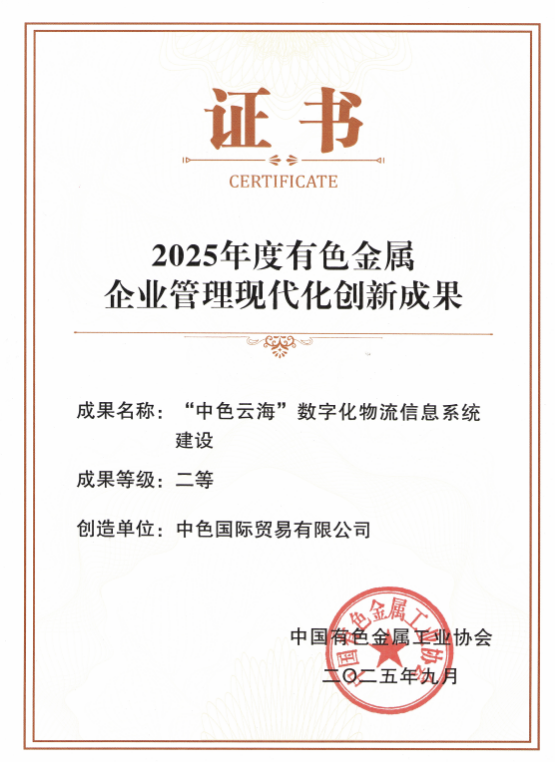 近日,中色国际贸易有限公司(以下简称“中色国贸”)自主建设并运营的“中色云海”数字化物流信息系统,荣获中国有色金属工业协会“2025年度有色金属企业管理现代化创新成果”二等奖,标志着中色国贸在通过技术创新赋能管理升级方面获得行业高度认可,为提升全球供应链韧性提供创新范式。