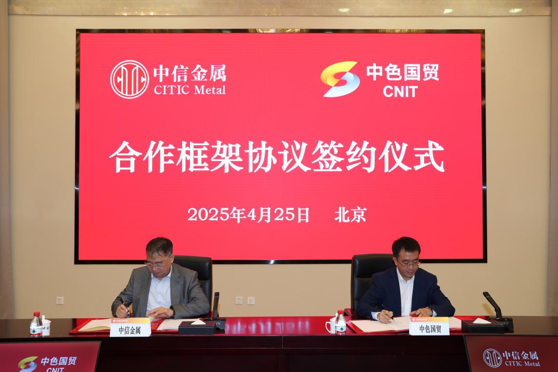 2025年4月25日,中色国际贸易有限公司(以下简称“中色国贸”)与中信金属股份有限公司(以下简称“中信金属”)在京举行了合作框架协议签约仪式。中色国贸党委书记、董事长杜兴荣,中信金属党委书记、董事长吴献文就深化多领域务实合作进行深入交流。双方团队共同参与会谈,并见证合作框架协议签署。