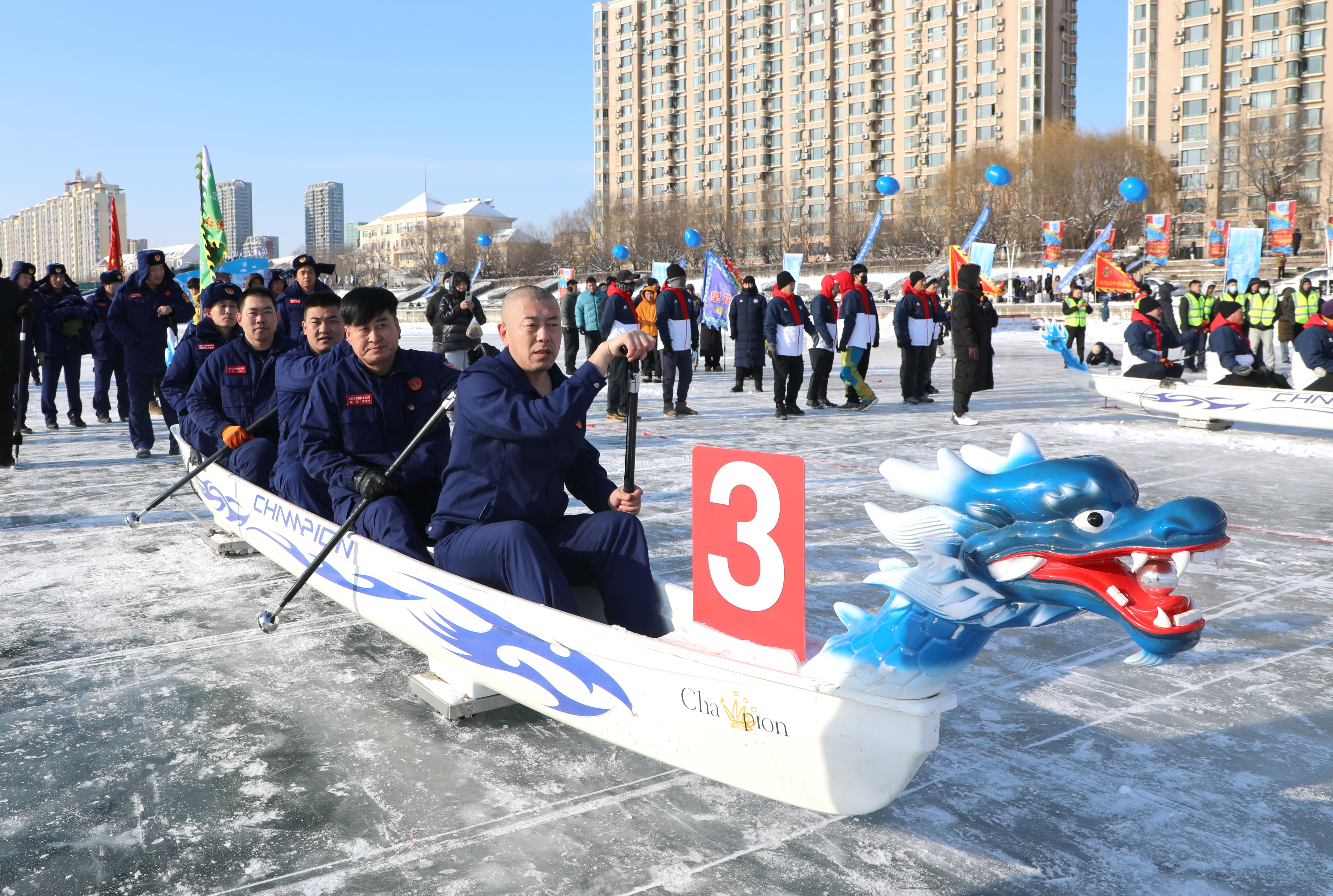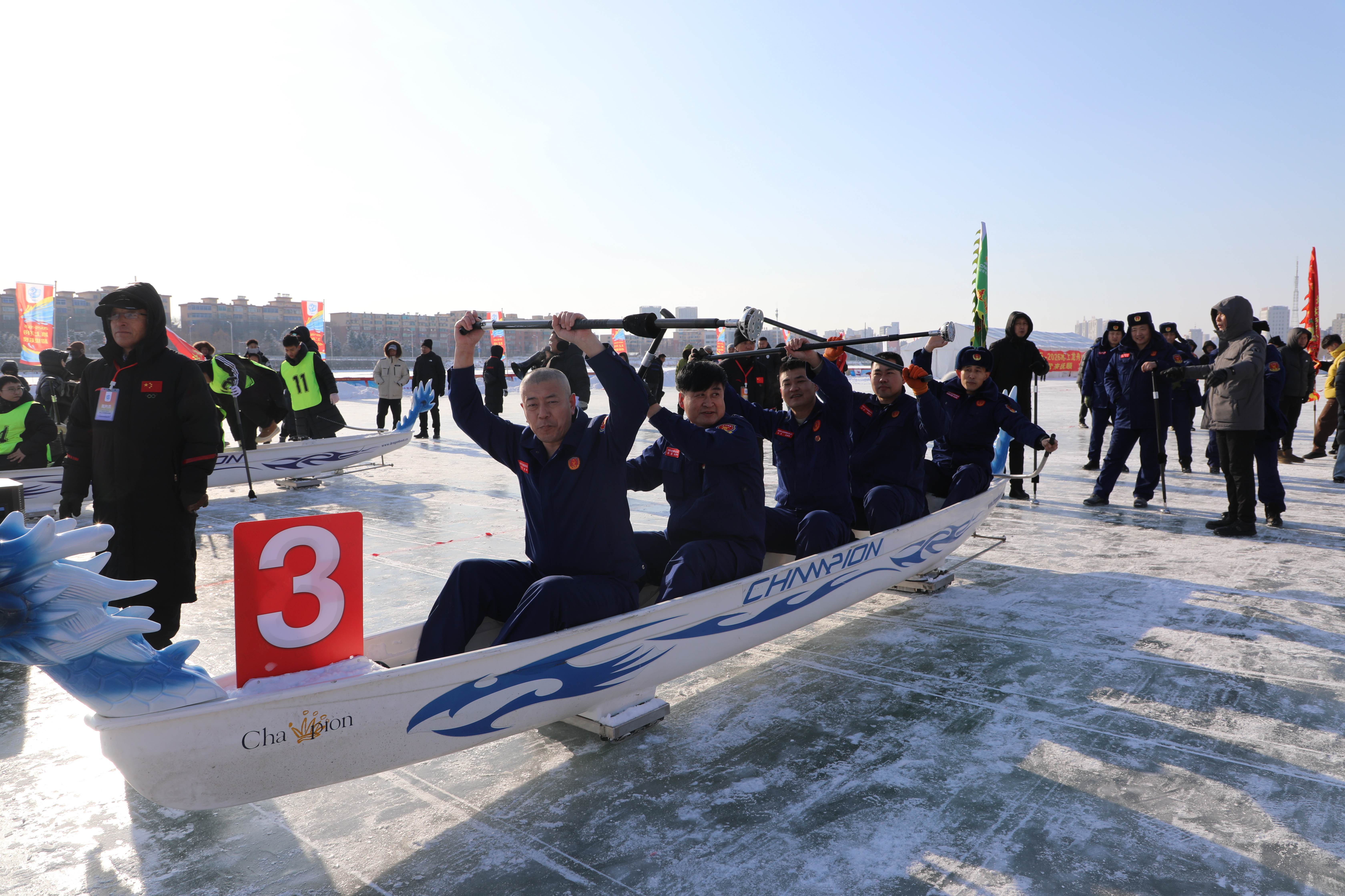 冰上龙舟作为传统龙舟与冰雪运动的创新融合,以其风驰电掣的速度感与高强度的协作要求,成为检验团队实力的终极赛场。比赛当日,抚顺赛场的冰面寒气凛冽,但队员们个个精神抖擞、斗志昂扬。随着发令枪响,队员们伴随铿锵鼓点,挥桨如飞,冰钎与冰面碰撞出激昂的“战歌”。提桨、破冰、划动,每一个动作都整齐划一、刚劲有力,龙舟如离弦之箭般在冰面飞驰,尽显红透山人敢打敢拼的硬核风采。
