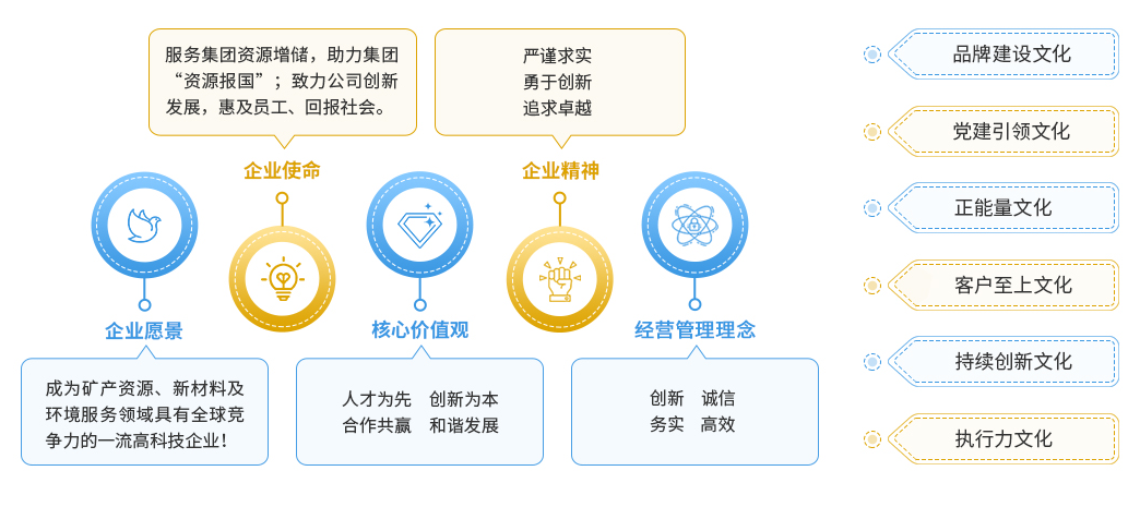 企业愿景:成为矿产资源、新材料及环境服务领域具有全球竞争力的一流高科技企业!