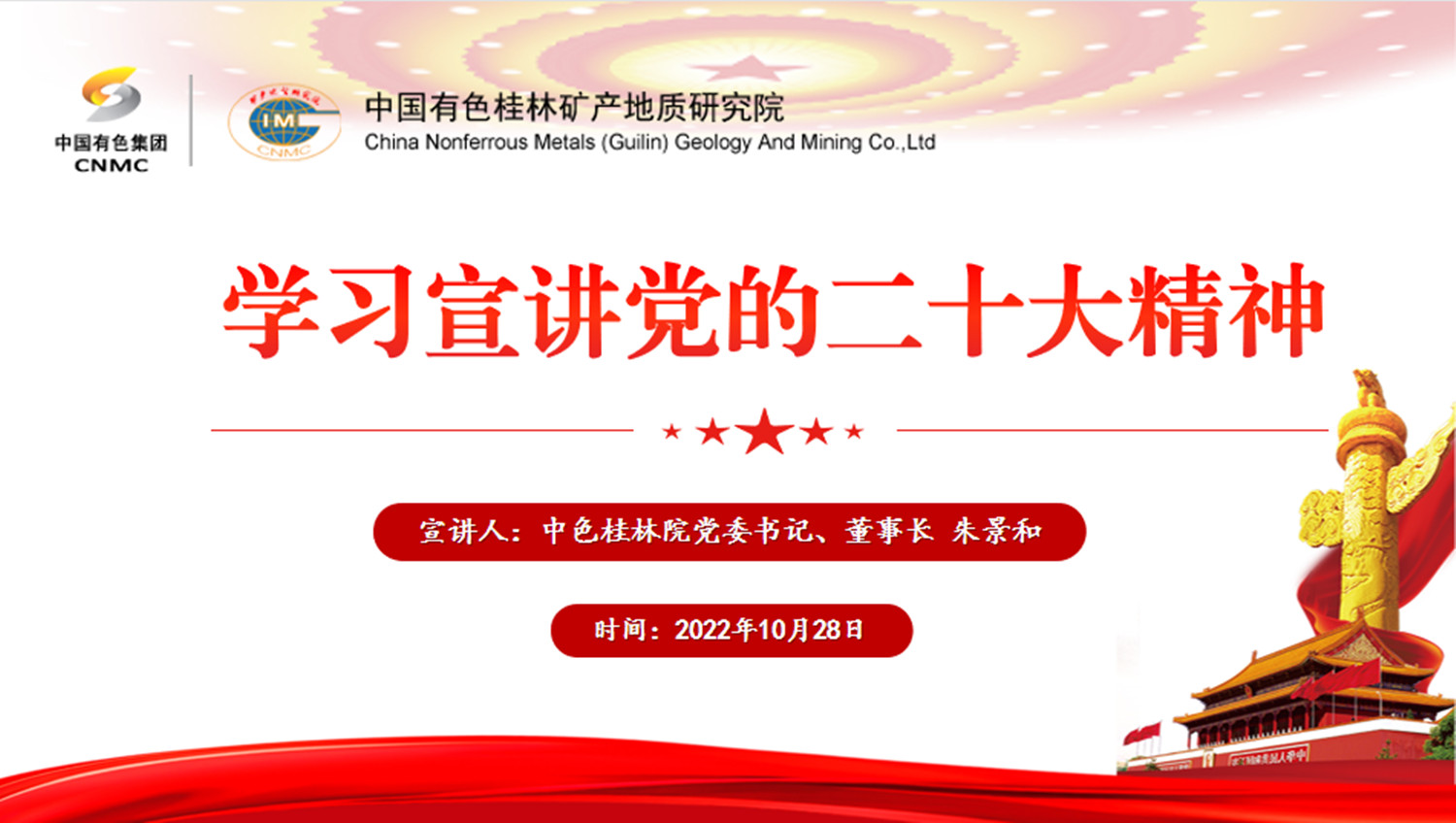 10月28日上午,中色桂林院召开党委理论学习中心组会议,专题学习党的二十大精神。党委书记、董事长朱景和主持会议,带头学习宣讲党的二十大精神并讲话。