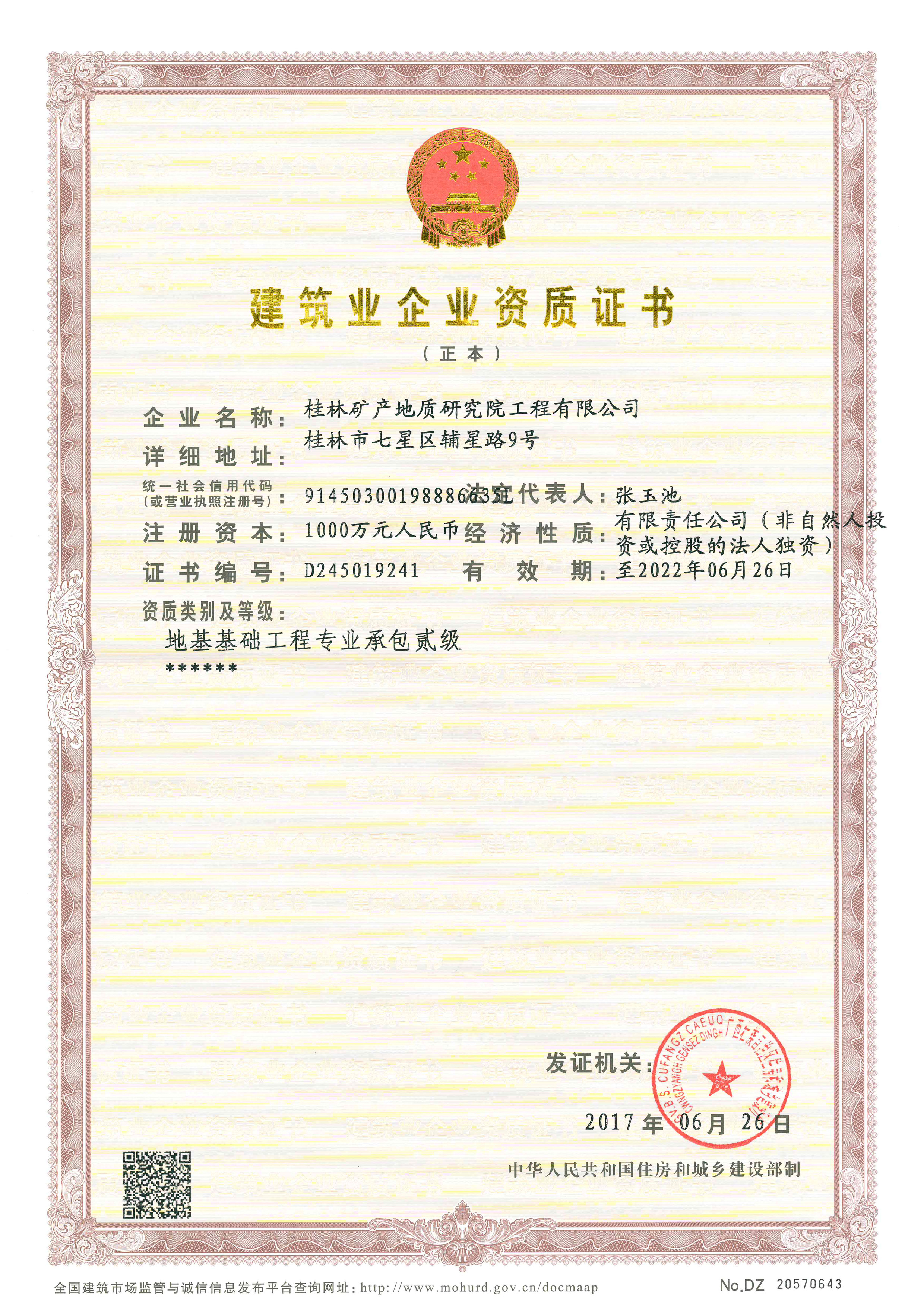 | 2016.11.14-2022.11.13 | 广西壮族自治区住房和城乡建设厅 | 工程 公司 | 桂林矿产地质研究院工程有限公司 |