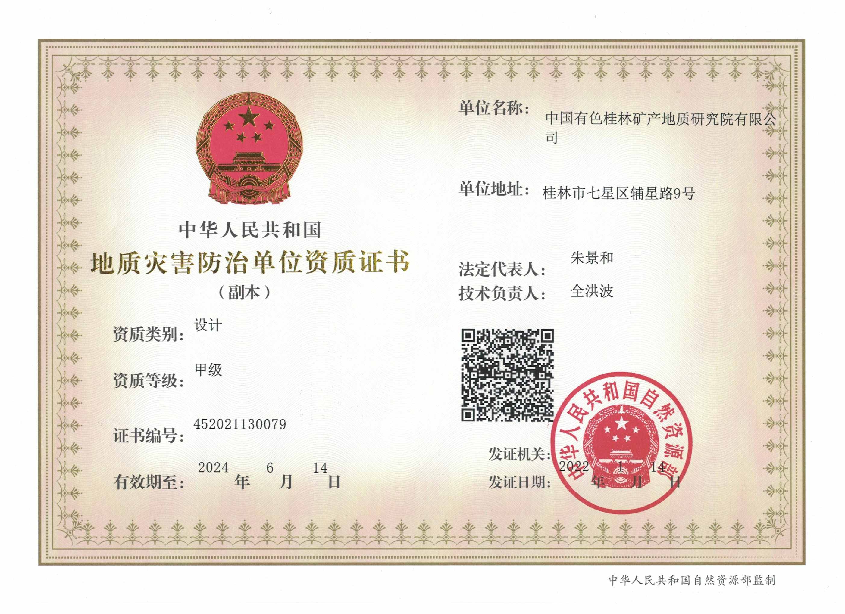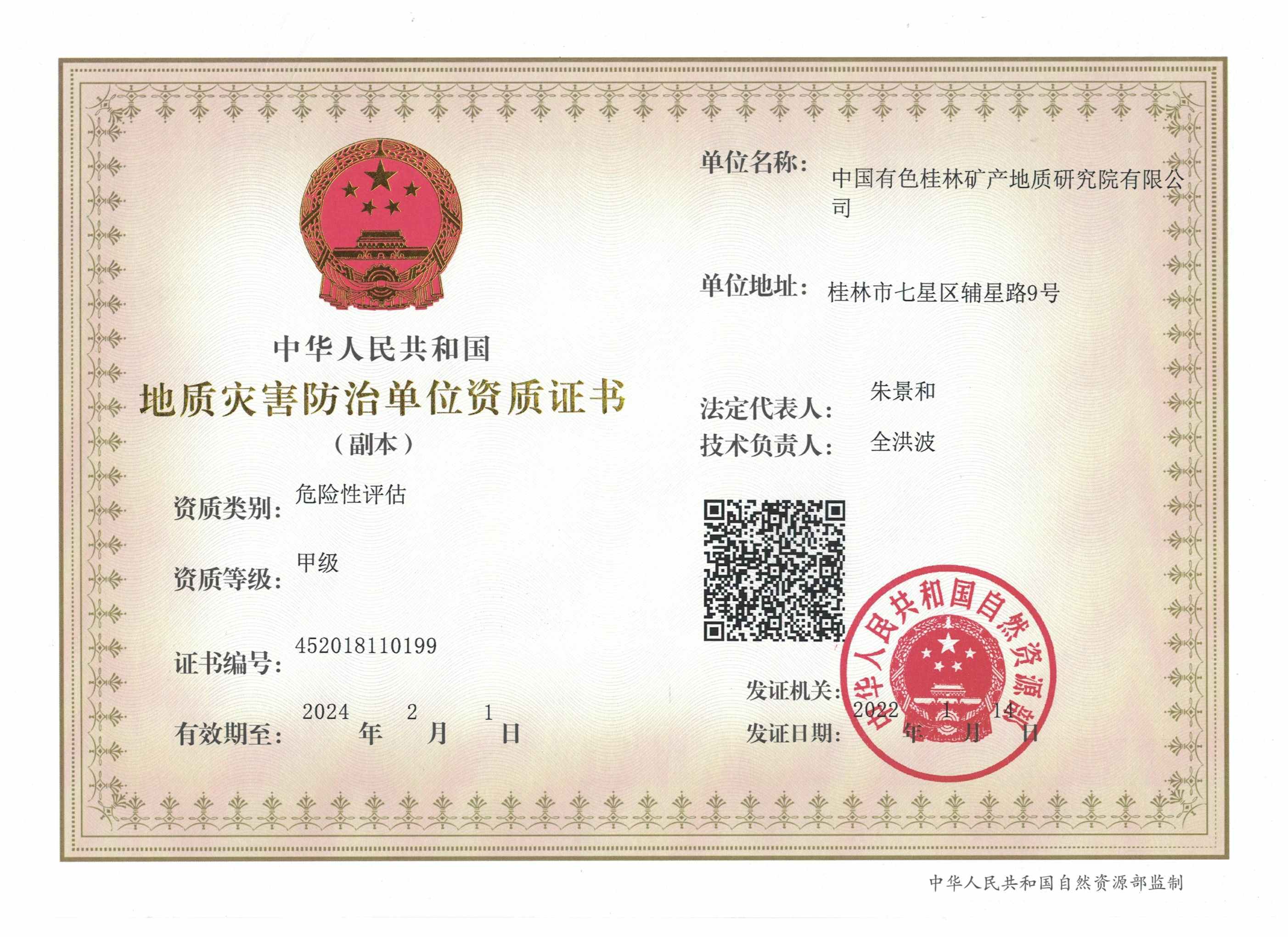 1 | 地质灾害防治危险性评估 证书编号:452018110199 | 甲级 | 2018.2.28-2021.2.28 2021.2.2-2024.2.1 | 中华人民共和国国土资源部 | 博泰 环保所 | 中国有色桂林矿产地质研究院有限公司 |