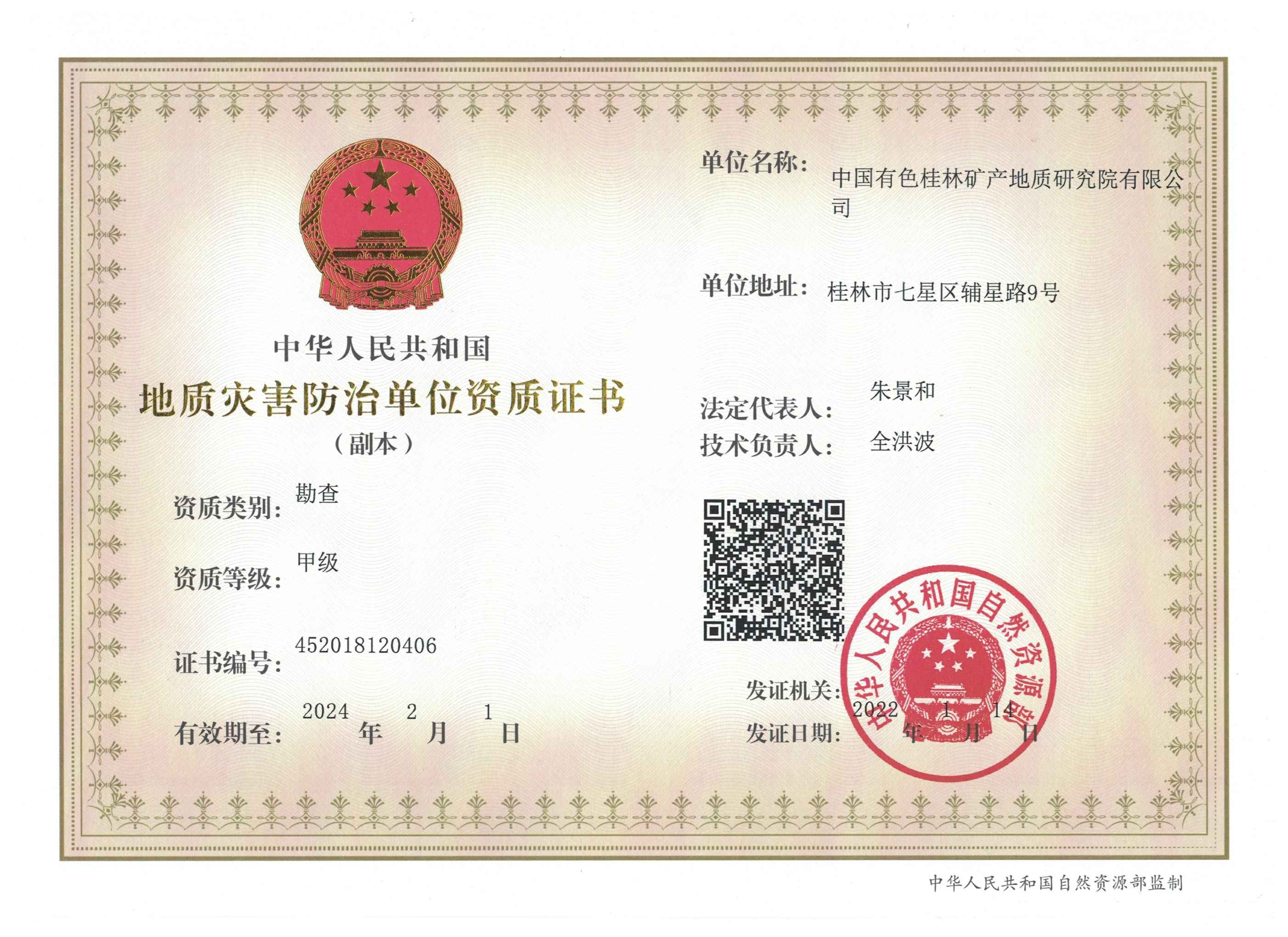 2 | 地质灾害防治勘查 证书编号:452018120406 | 甲级 | 2018.2.28-2021.2.28 2021.2.2-2024.2.1 | 中华人民共和国国土资源部 | 博泰 环保所 | 中国有色桂林矿产地质研究院有限公司 |