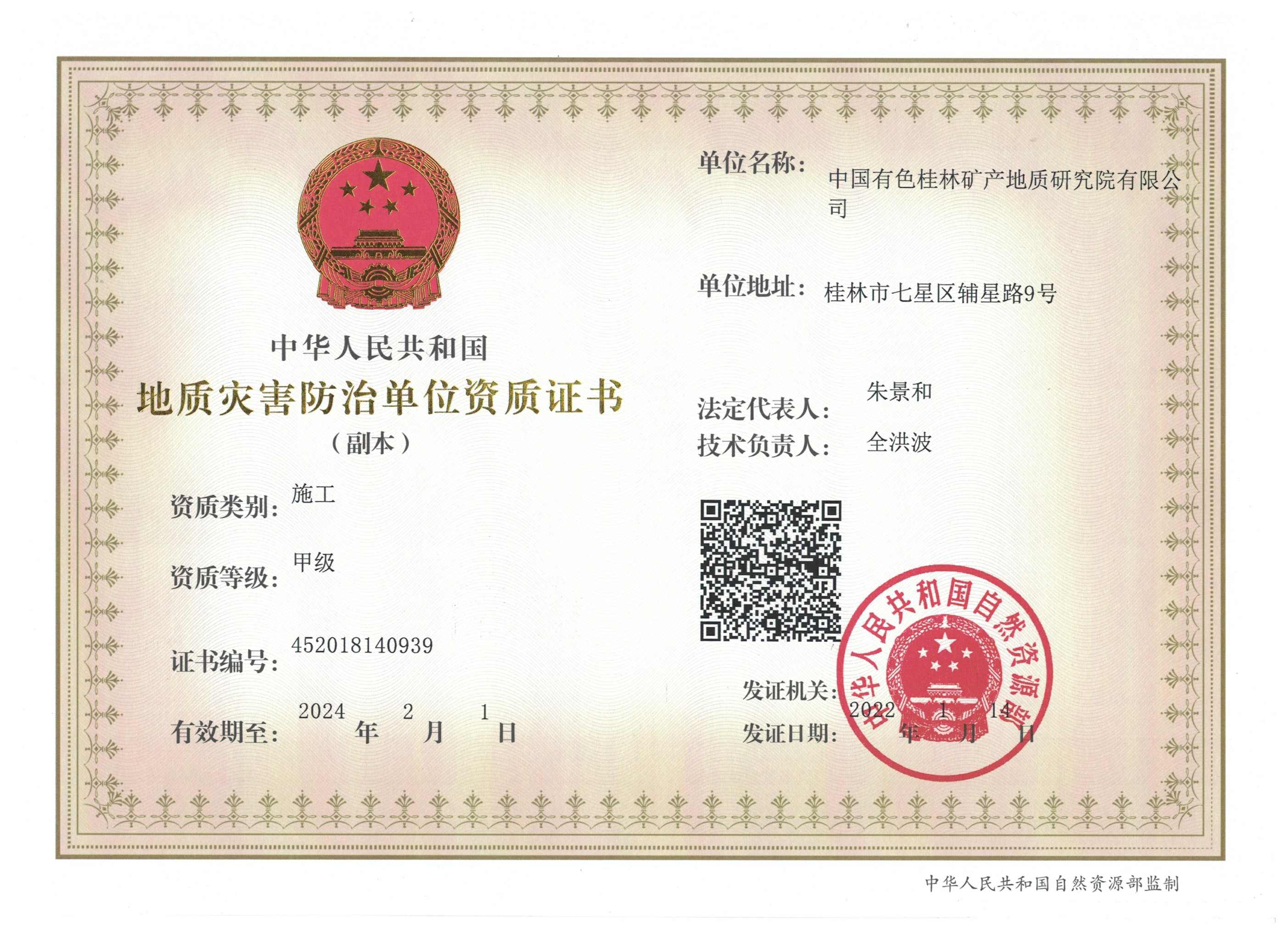 3 | 地质灾害防治施工 证书编号:452018140939 | 甲级 | 2018.2.28-2021.2.28 2021.2.2-2024.2.1 | 中华人民共和国国土资源部 | 博泰 环保所 | 中国有色桂林矿产地质研究院有限公司 |