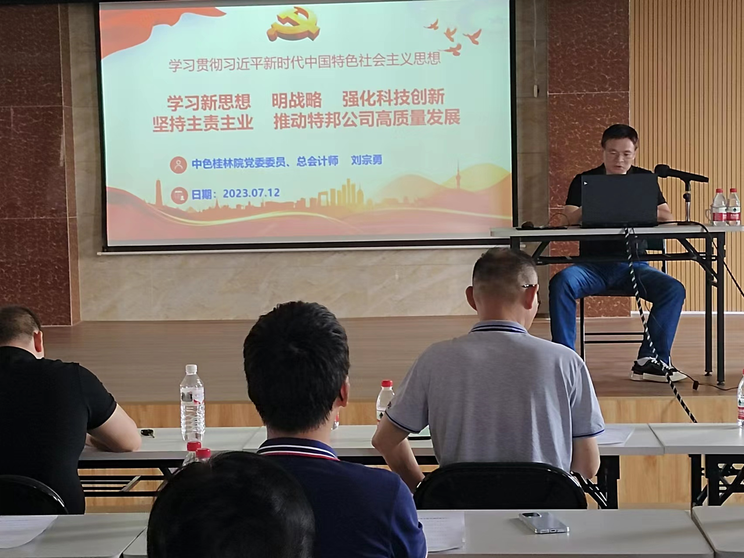 为扎实开展学习贯彻习近平新时代中国特色社会主义思想主题教育,7月12日下午,中色桂林院党委委员、总会计师刘宗勇以《学习新思想,明战略,强化科技创新,坚持主责主业,推动特邦公司高质量发展》为题到特邦公司讲专题党课,充分发挥引学、带学、促学的作用。特邦公司党支部全体党员参加活动。