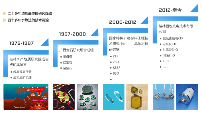 桂林百锐光电技术有限公司,成立于2012年,是一家专业从事水热法功能晶体生长、晶体器件生产、销售为一体的国家级高新技术企业、广西“瞪羚企业”,前身为桂林矿产地质研究院成岩成矿实验室,曾通过水热法生长获得我国第一颗宝石级祖母绿和红宝石。