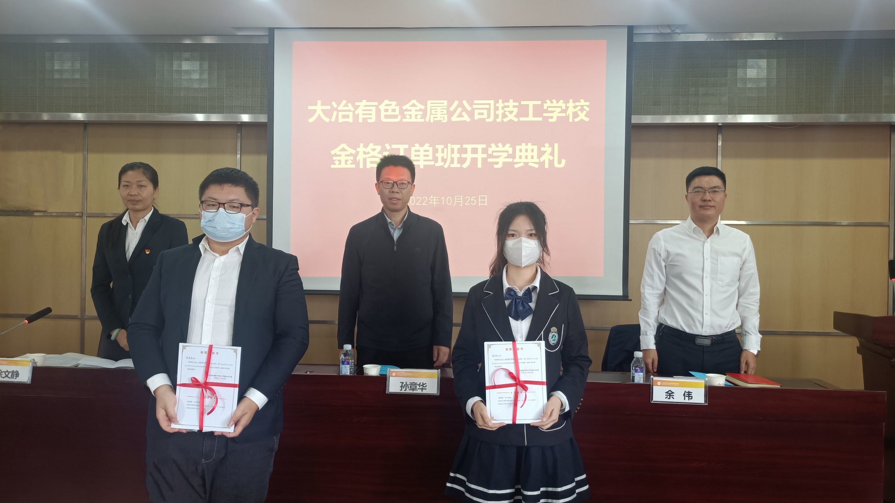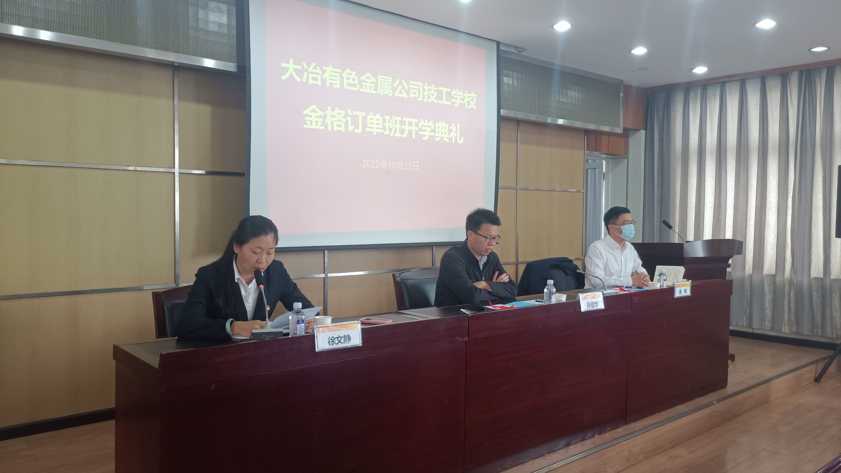 10月25日上午,大冶有色金属公司技工学校金格订单班在1号楼701会议室举行了开学典礼。校长孙章华、副校长徐文静、金格公司副总经理余伟、金格公司人力资源部部长包小兰、订单班全体任课老师、全体学生及相关科室负责人参加了典礼。本次典礼由徐文静副校长主持。