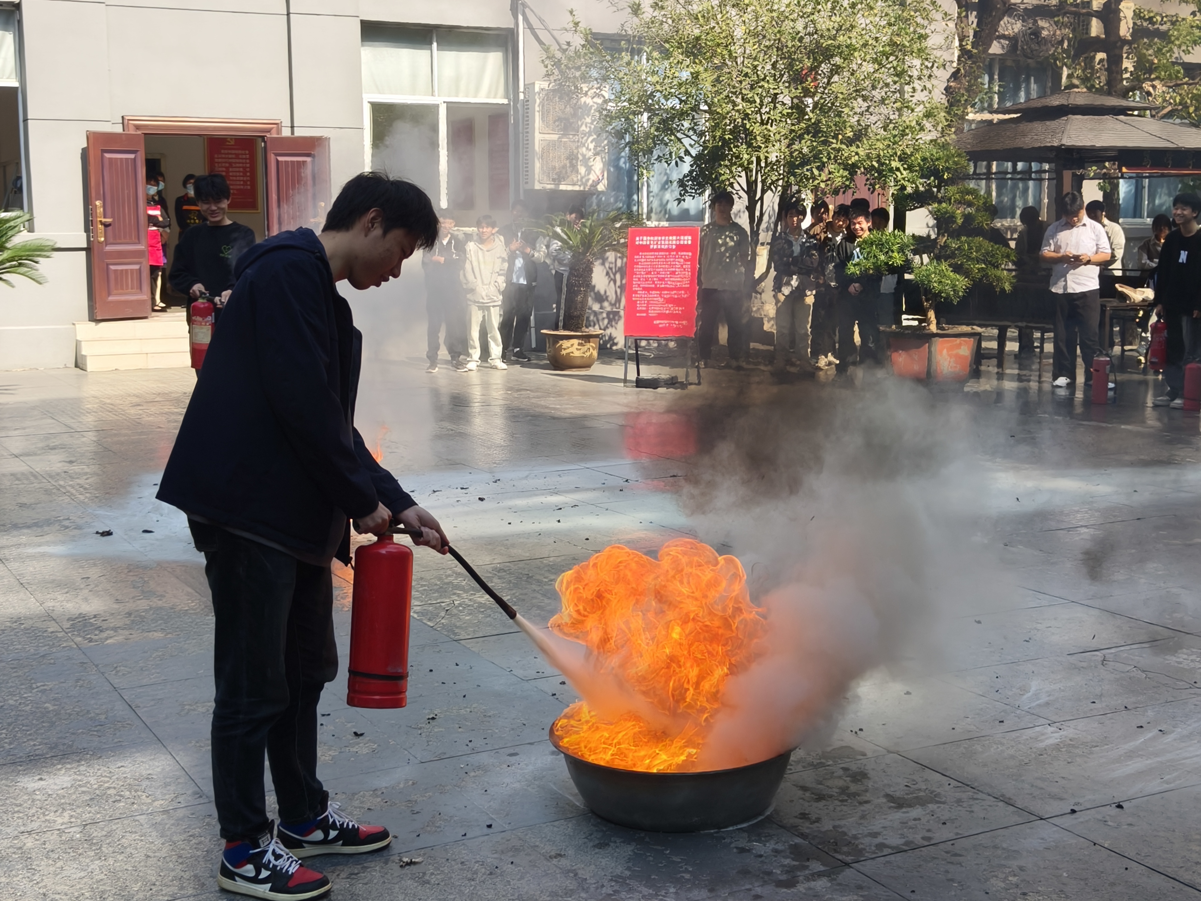 讲座现场,职教中心总务科科长石坚深入浅出地讲解了消防知识,包括火灾预防、火灾类型识别以及初期火灾应对方法等,让每一位参与者深刻认识到消防安全的重要性。随后的油盆灭火演习将活动推向高潮,参与者们在专业指导下,亲身体验了使用灭火器扑灭油盆火灾的过程,切实掌握了灭火技巧。