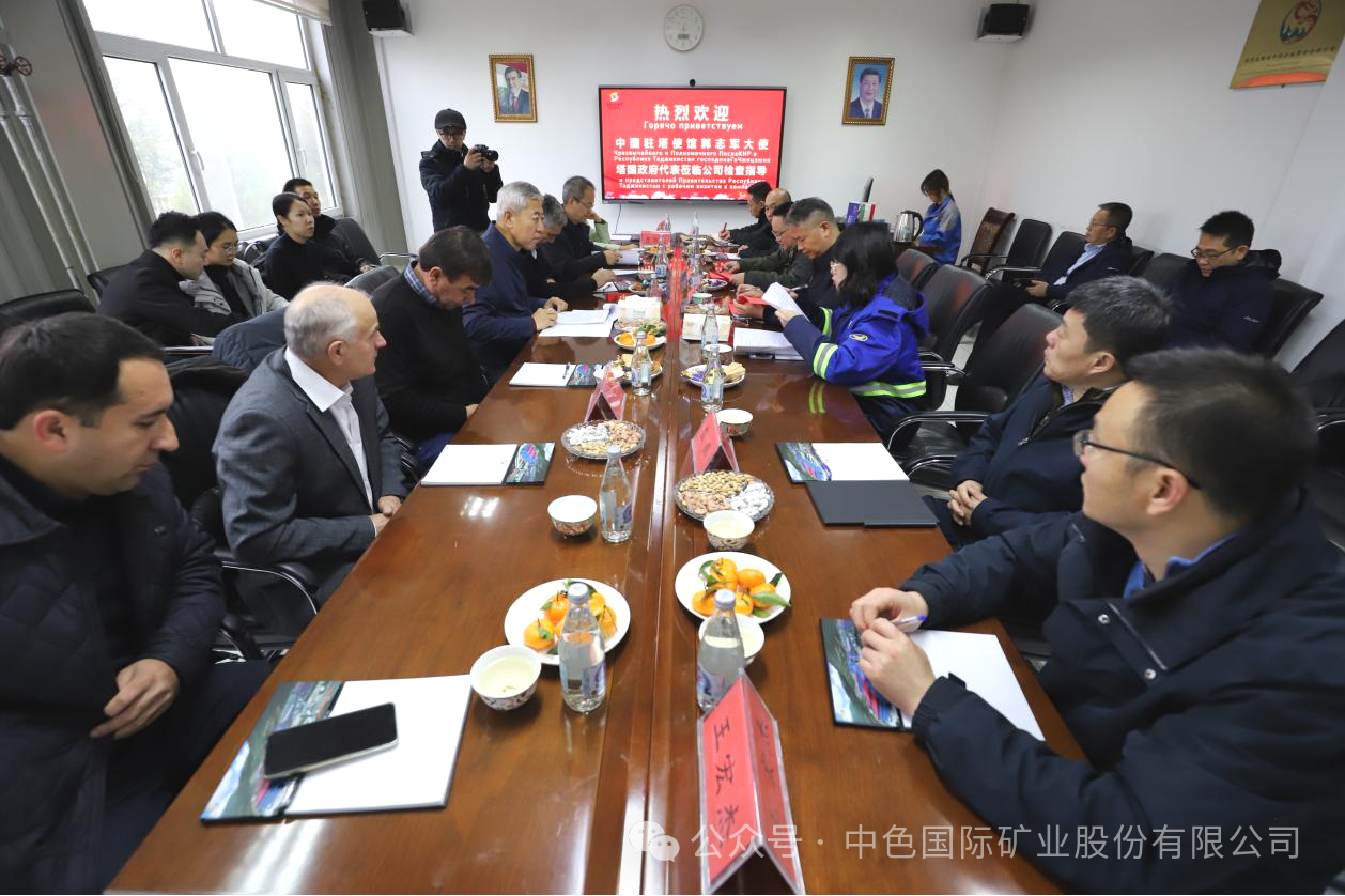 植树活动结束后,郭志军大使和纳斯鲁洛·马赫穆佐达主席等一行专程前往中色国矿帕鲁特公司冶炼厂进行座谈交流。中色国矿董事长徐宗西详细汇报了公司在安全生产、科技攻关、资源保障、精细化管理以及履行社会责任等方面的工作进展与未来规划。双方围绕深化中塔矿业合作、推广绿色低碳技术、促进当地经济社会可持续发展等议题进行了深入务实的交流探讨。